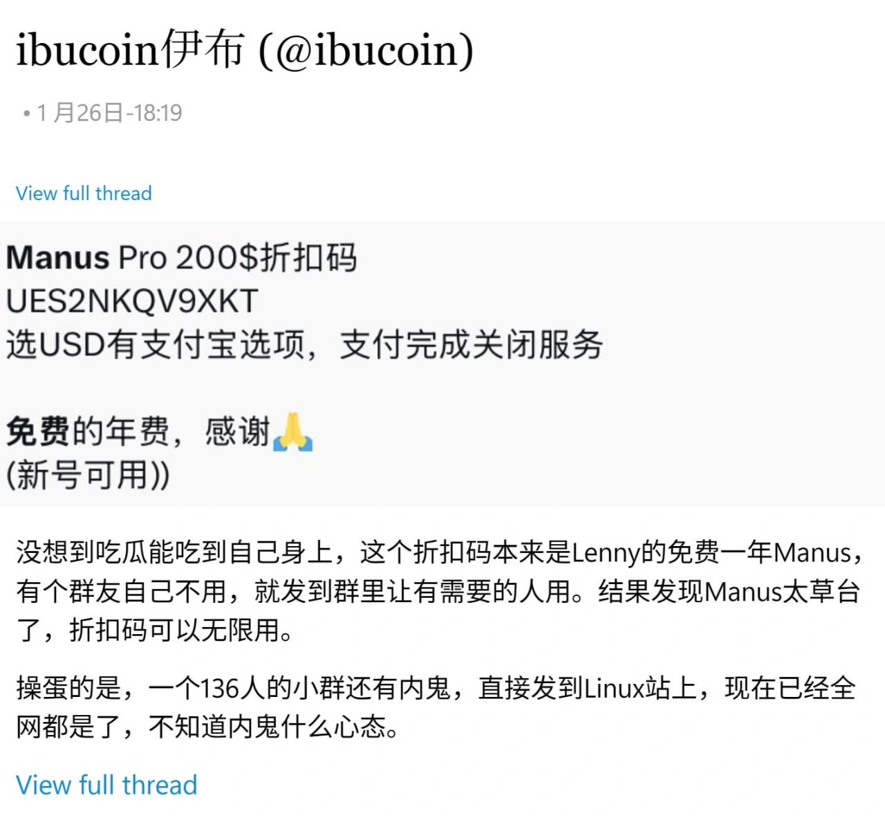 一个一年manus折扣码引起的热闹,今晚有个不需要的折扣码被分享到群里,然后发现manus草台班子没做限制,可以无限用。