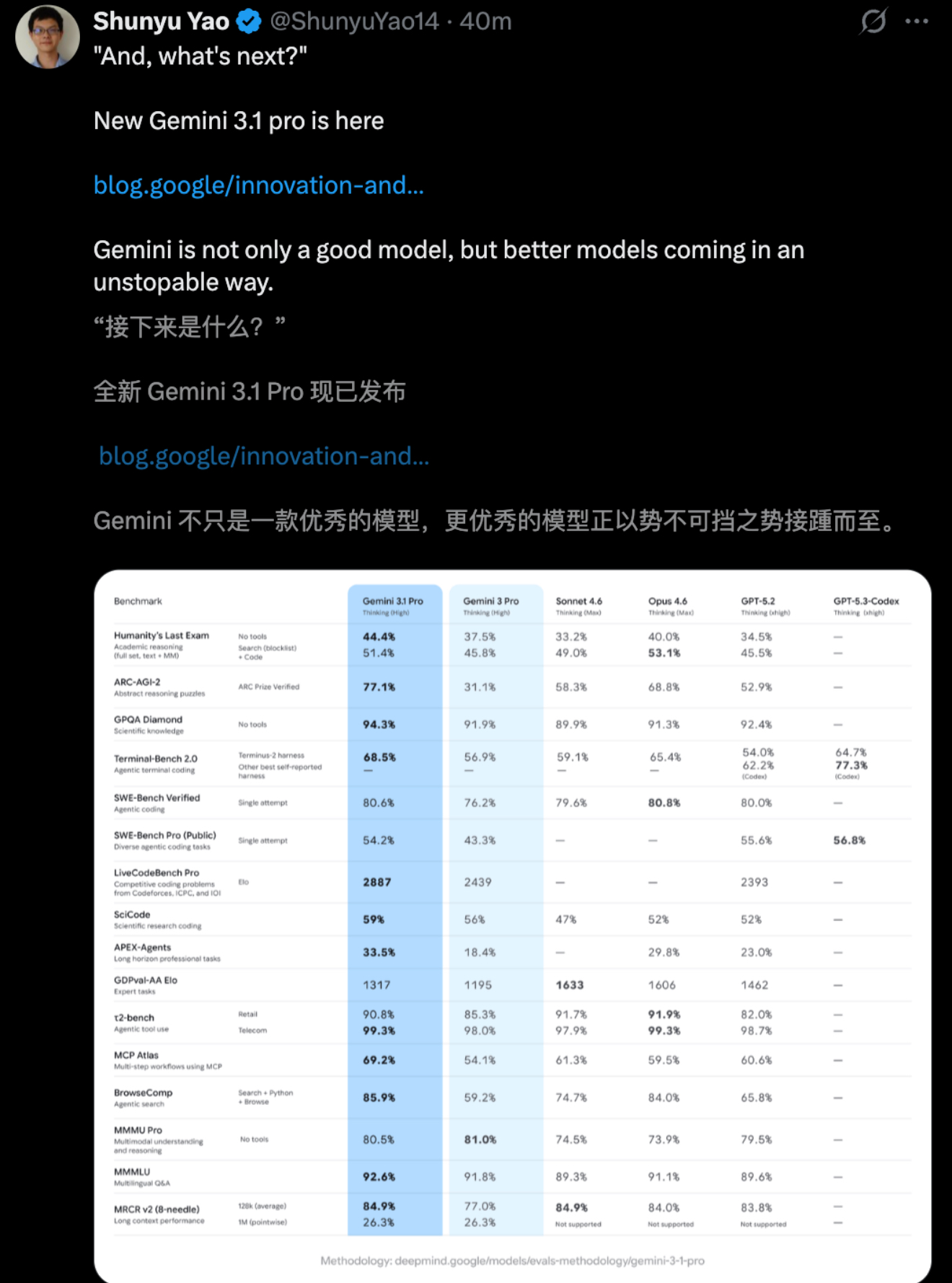 谷歌新一代旗舰模型Gemini 3.1 Pro登场了 AI 2月20日 微尘站长 取消关注 关注 私信 谷歌DeepMind深夜扔出核弹,下一代Gemini 3.1 Pro正式登场。在公认的最难ARC-AGI-2测试中,它拿下最高分直接看呆硅谷,推理狂飙2倍,直接把Claude 4.6拉下王座。