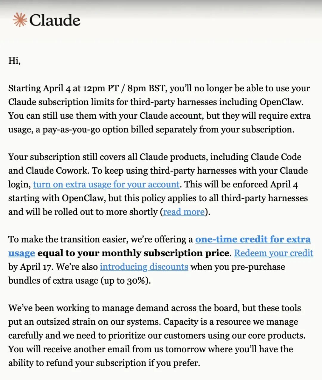很多 OpenClaw 用户的邮件收件箱,悄悄多了一封邮件,邮件内容不长,但信息量很大:从太平洋时间 4 月 4 日起,用户将无法再使用您的 Claude 订阅额度访问包括 OpenClaw 在内的第三方工具。
