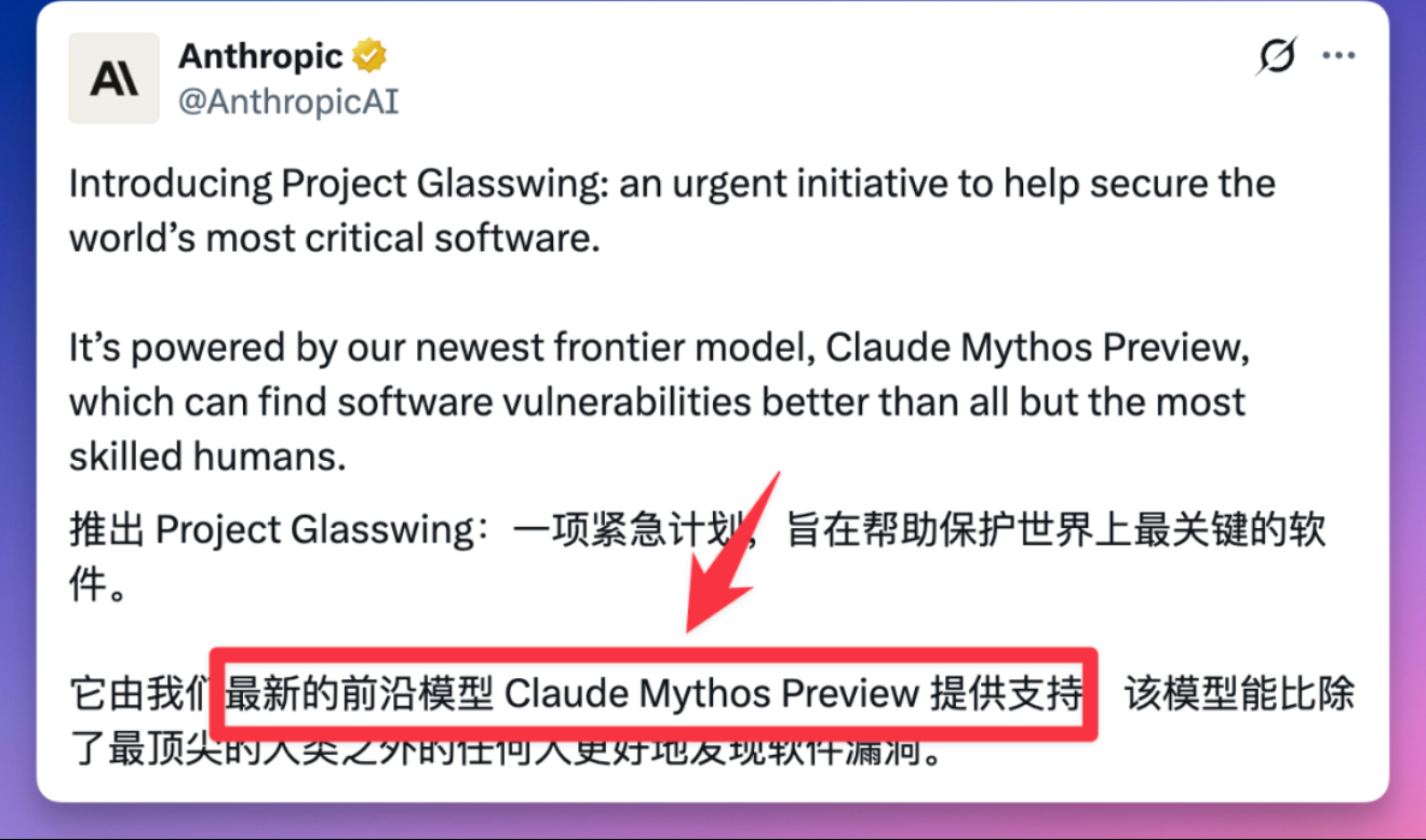今天凌晨,Anthropic 发起了一个叫 Project Glasswing 的网络安全计划。最新模型 Mythos Preview 已经定向开放给 12 家合作伙伴和 40 多家基础设施组织,专门用来找软件漏洞。苹果、亚马逊、谷歌、微软、英伟达、思科、CrowdStrike、摩根大通、Palo Alto Networks、博通、Linux 基金会。